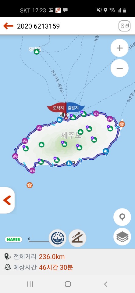 제주환상 종주 트랭글웹 기록 236km, 운동시간 26시간 11분,평균시속 18.5km