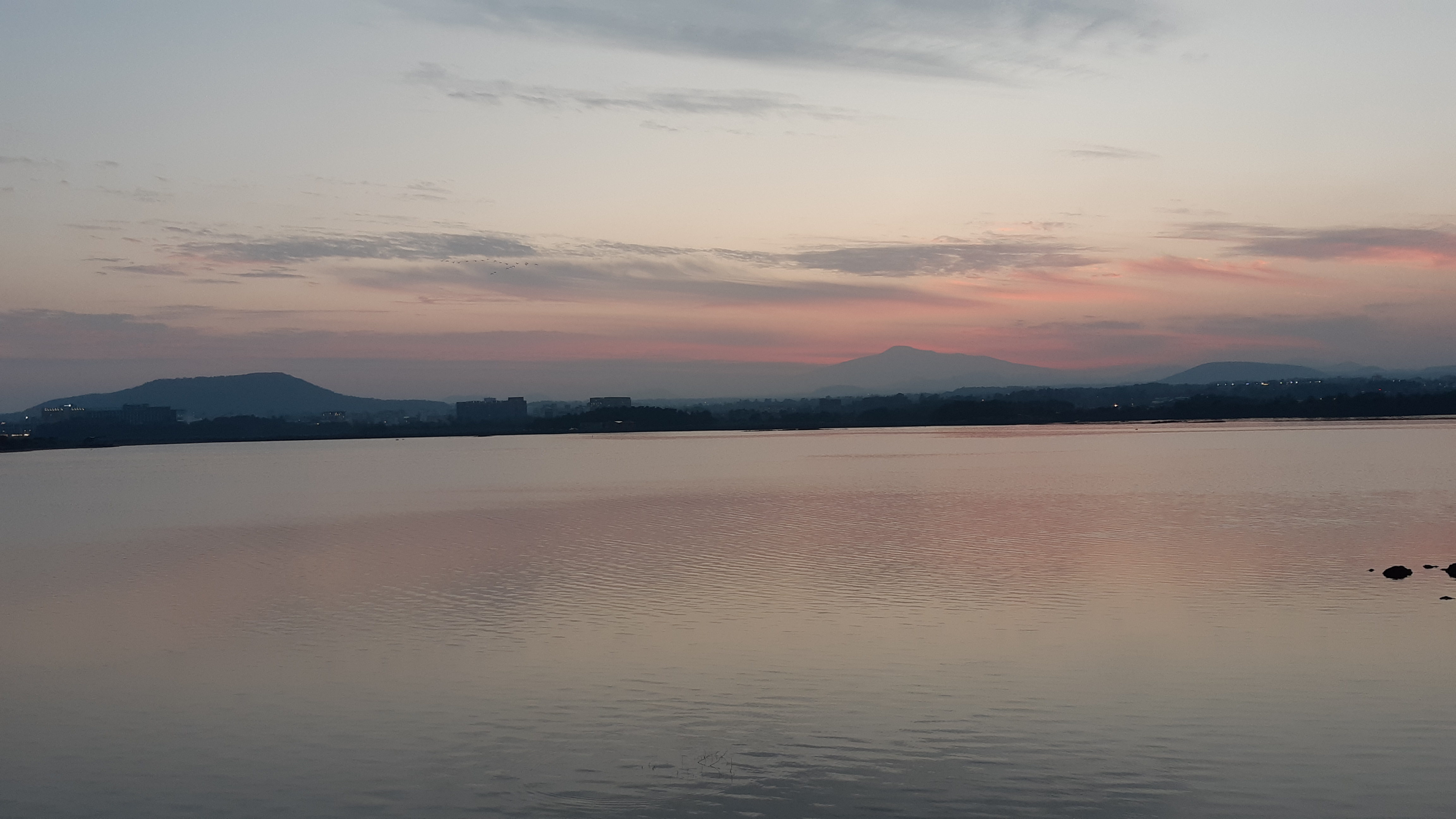 성산일출인증센터 가는 길에 석양에 물든 한라산