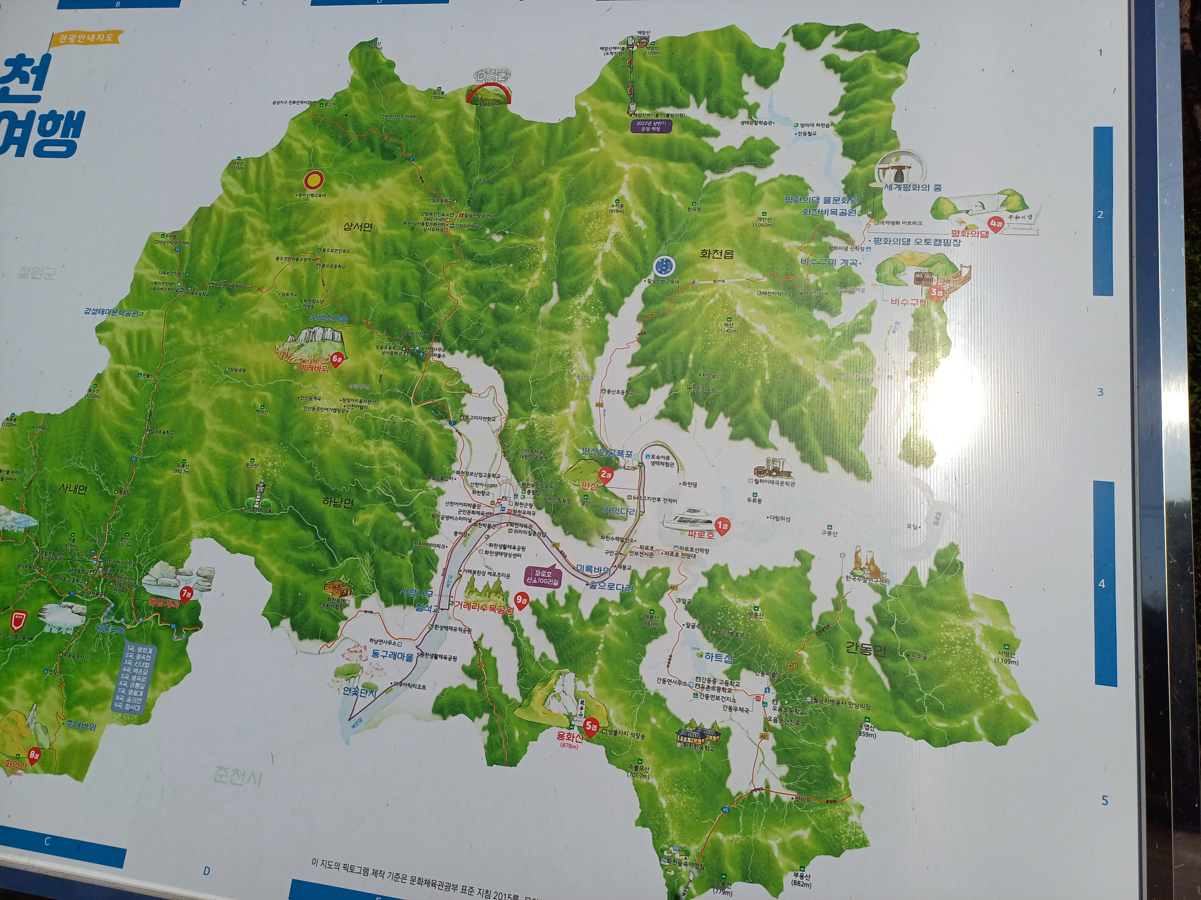 온전히 화천산소100리길만 둘러보는 코스 화천시내에서 북한강줄기 타고 내려갔다 강건너 편으로 해서 화천댐에 갔다 다시 화천시내 복귀하는 코스 약42km.
